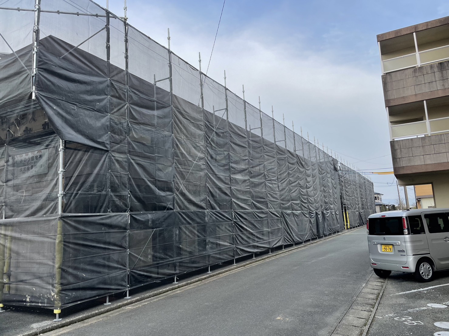 今回は久留米市で実施した、外壁塗装にともなう足場工事の様子をご紹介します。